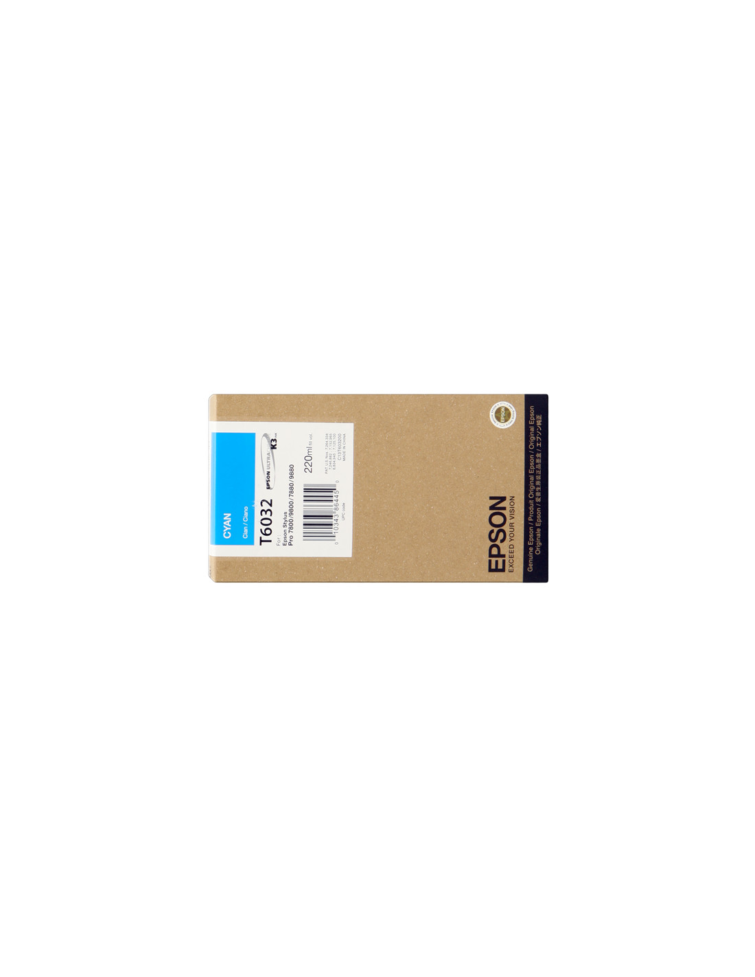 La Cartouche d'encre Epson référence C13T603200 de couleur cyan, est donnée par le constructeur pour une capacité de 220 ml. Cette cartouche est compatible avec les imprimantes Epson Stylus Pro 7800, Stylus Pro 9800, Stylus Pro 7880, Stylus Pro 9880