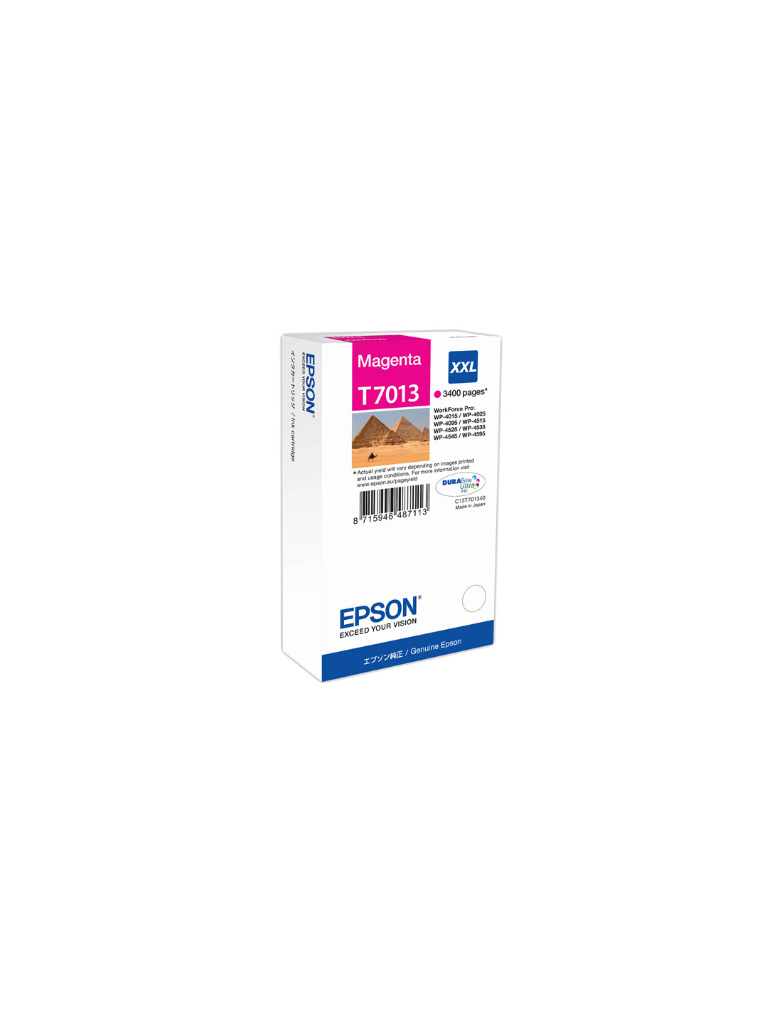 La Cartouche d'encre Epson référence C13T70134010 de couleur , est donnée par le constructeur pour une capacité de 3 400 pages. Cette cartouche est compatible avec les imprimantes Epson WorkForce Pro WP-4015DN, WorkForce Pro WP-4515DN, WorkForce Pro WP-4525DNF, WorkForce Pro WP-4595DNF, WorkForce Pro WP-4095DN, WorkForce Pro WP-4095DN