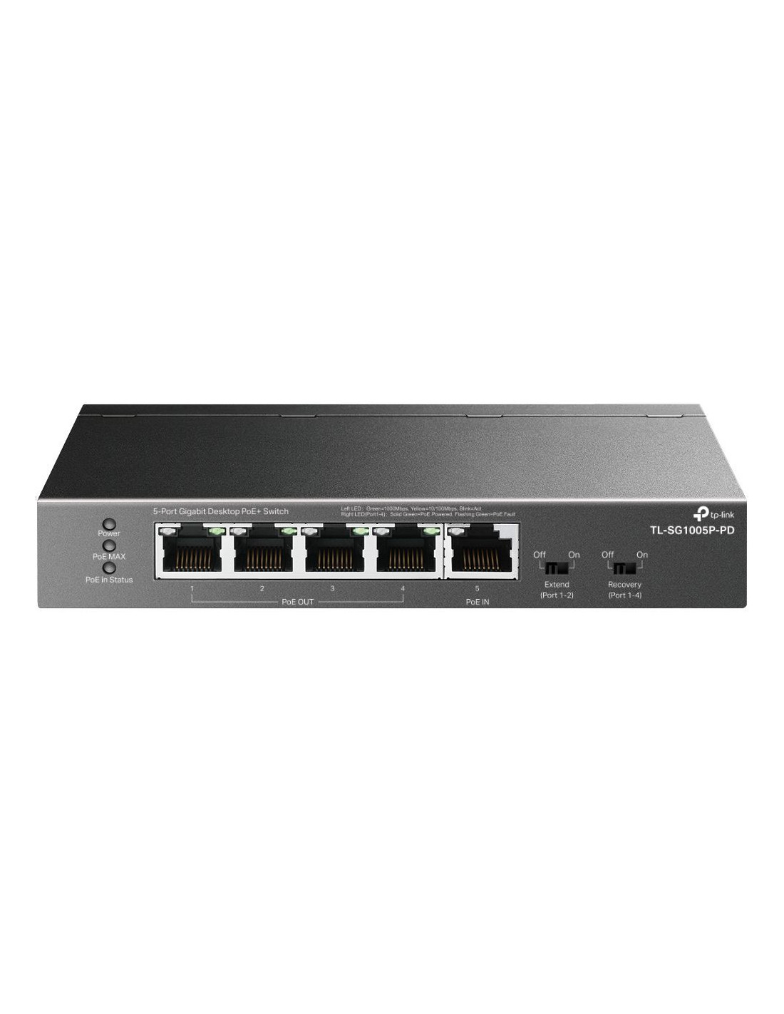 - Ports: 4× ports Gigabit PoE+ Out, 1× port Gigabit PoE++ In