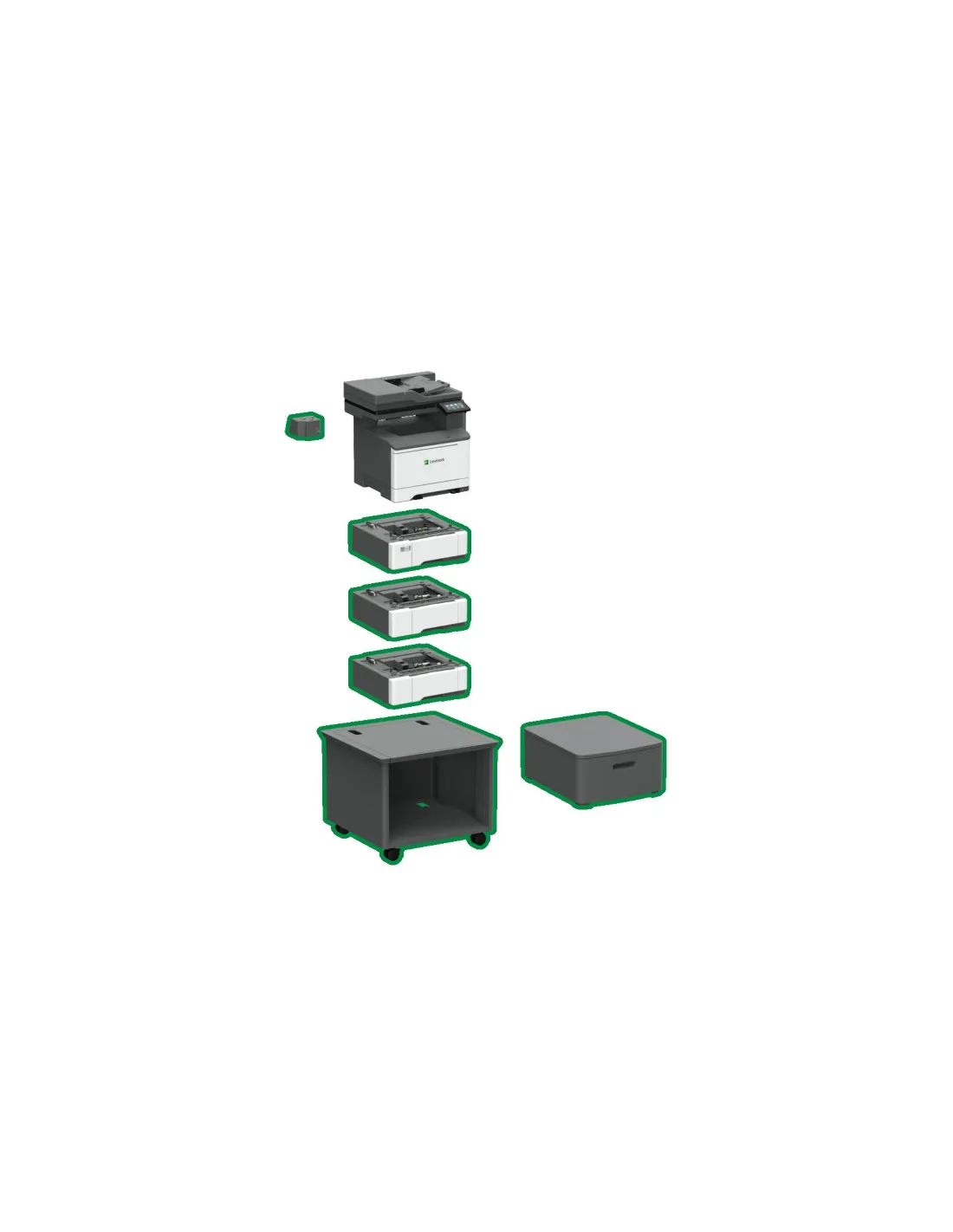 - Options supplémentaires : Si besoin, vous pouvez opter pour un bac additionnel 650 pages et/ou une installation complète avec connexion sur plusieurs postes, accompagnée d'une formation pour vos utilisateurs.
