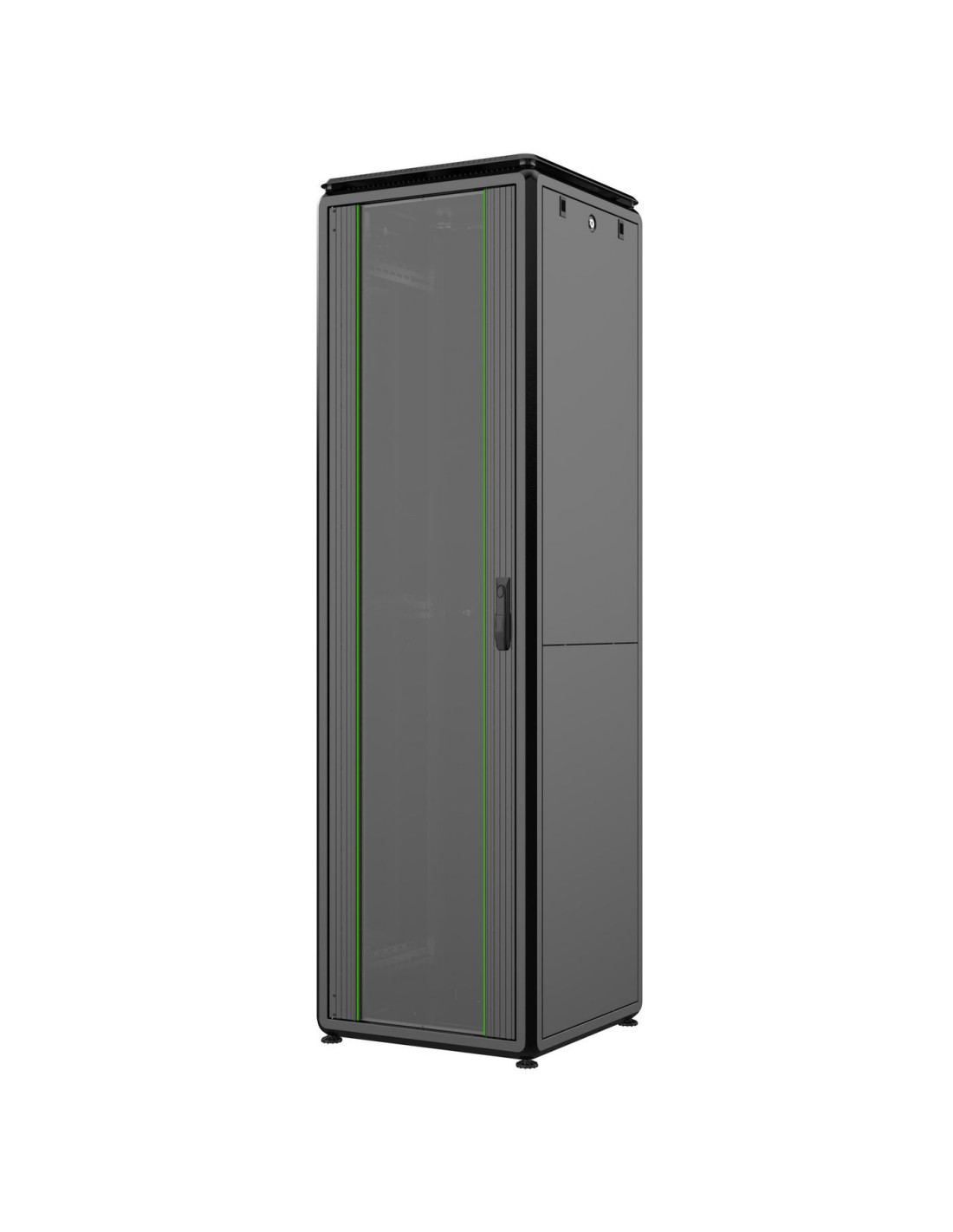 Avec des renforts latéraux et des points de soutien en cube omega, cette armoire possède une robustesse maximale. Les panneaux latéraux sont facilement amovibles et incluent un système de verrouillage à barillet. Les armoires de hauteurs 42U et 46U disposent de panneaux latéraux divisés verticalement, ce qui permet un retrait aisé lors de l'installation, de la maintenance ou lorsqu'il y a un espace restreint.