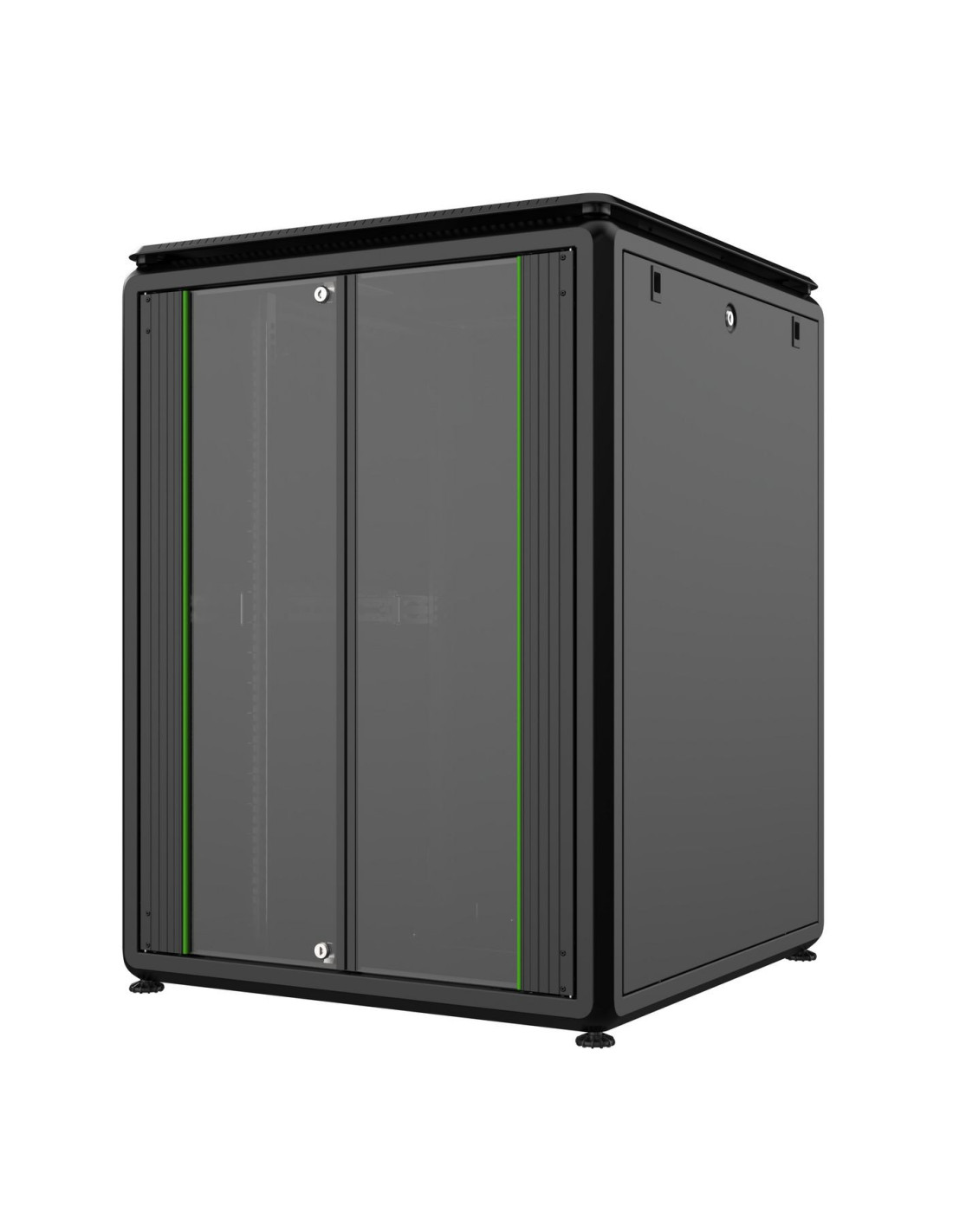 Le module de porte avant est constitué de portes en verre trempé anti-statique et résistantes aux chocs, avec un cadre métallique décoratif. Ces portes se verrouillent grâce à un mécanisme de verrouillage par poignée, garantissant la sécurité des équipements à l'intérieur. Les côtés de l'armoire sont renforcés avec des barres métalliques spéciales, verrouillables et interlockables, ajoutant encore à la sécurité.